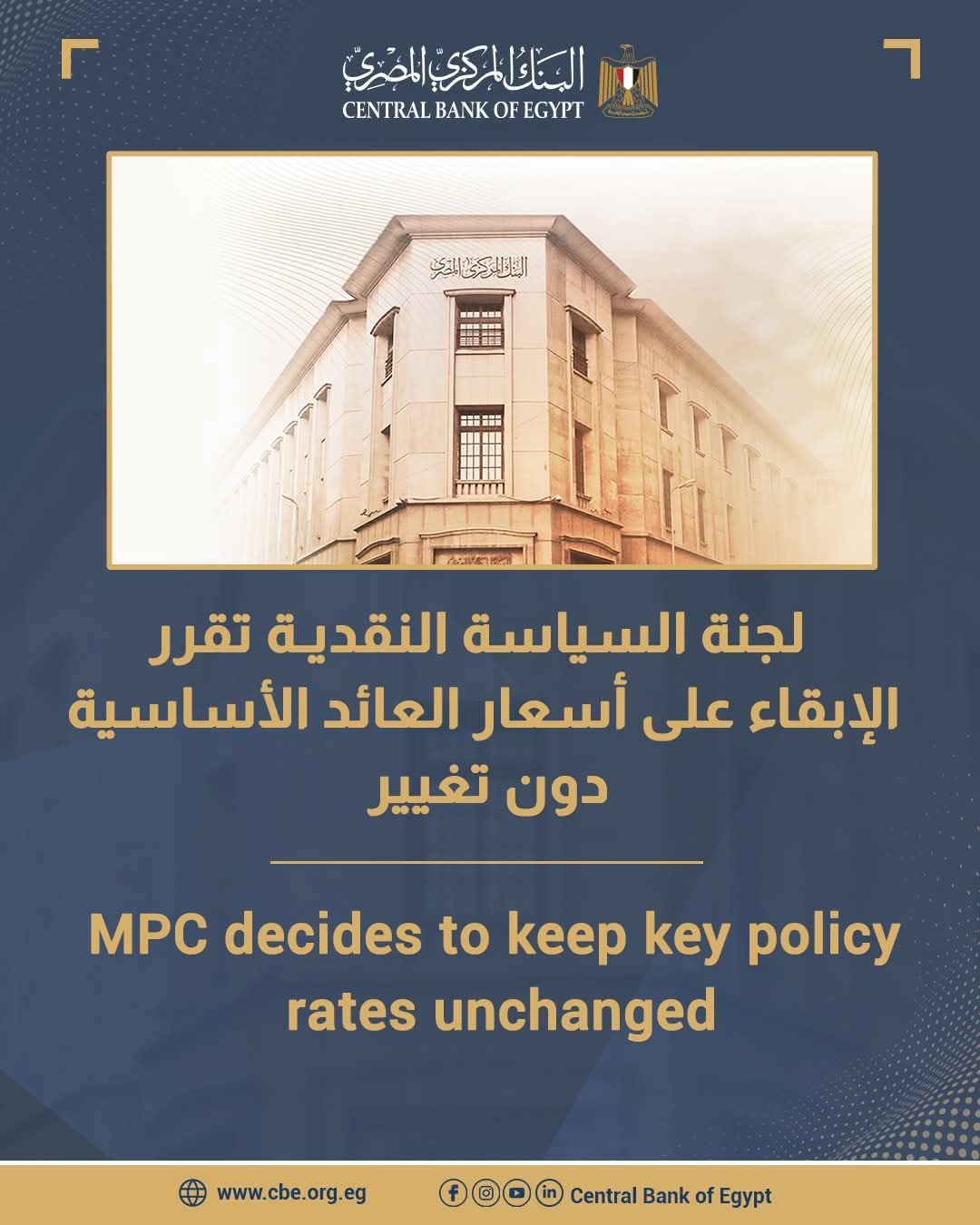 قررت لجنة السياسة النقديـة للبنك المركــزي المصـري في اجتماعهـا يــوم الخميس الموافـــق 2 إبريل 2026 الإبقاء على أسعار العائد الأساسية دون تغيير. وعليه، تقرر تثبيت سعري عائد الإيداع والإقراض لليلة واحدة وسعر العملية الرئيسية للبنك المركزي عند 19.00% و20.00% و19.50%، على الترتيب. كما تم الإبقاء على سعر الائتمان والخصم عند 19.50%. ويأتي هذا القرار انعكاسا لرؤية اللجنة لآخر تطورات التضخم وتوقعاته منذ اجتماعها السابق.